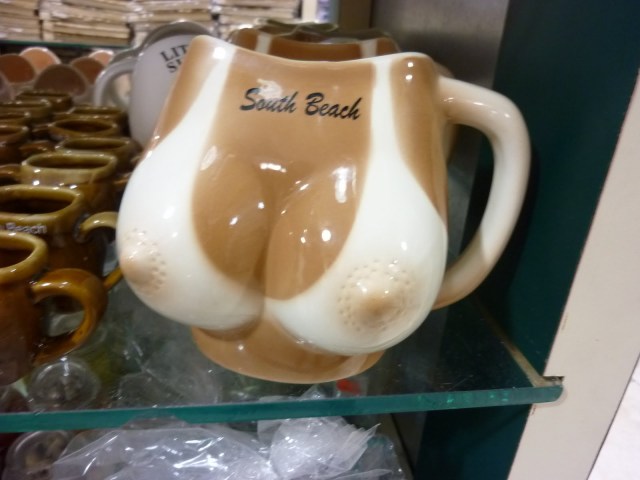 My wife went to Miami this past weekend for some R&R with the girls. Neither of us have been before but had our expectations from the stories from friends and what we’ve seen on CSI Miami. Anyways, from my wife’s descriptions and photos, most was what we expected. Art Deco architecture, hot weather, beaches, poolside bliss, beautiful people and good food. However, there were a few odd items that caught her eye. She went to a local gift/souvineer shop and came across some pretty unique items (maybe we’re not so well traveled, but I’ve never seen shit like this before).