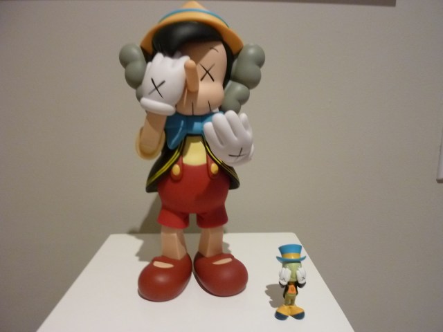 I picked up my second Kaws toy a month or so ago. This is KAWS’ rework of Disney’s Pinocchio and Jiminy Cricket characters. My friend Ryan built the stand for it using some plywood and an acrylic garbage container. The picture above was done by my niece when she was five.