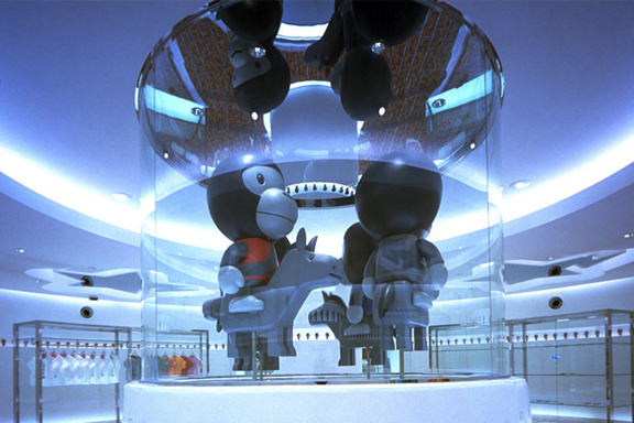 Once you reach the store in the basement, the army of apes continues to surround the perimeter of the shop. In the centre of the store, a life size merygoround of Milo apes awaits.