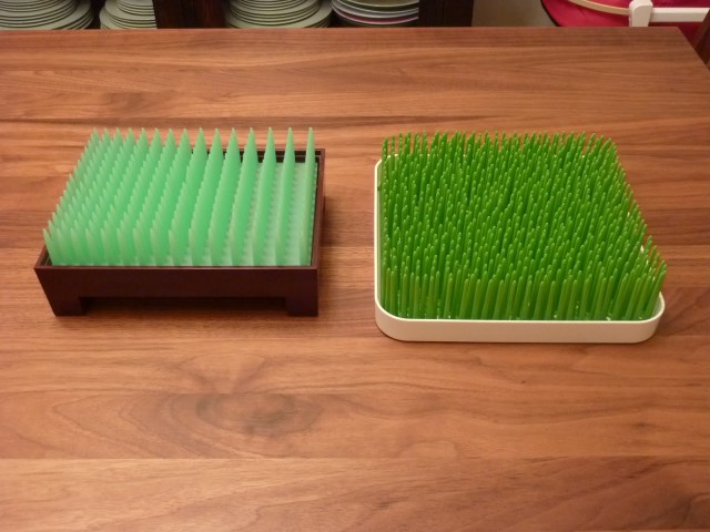 After purchasing it, I realized it was very similar to something I purchased about 5-6 years ago. We’ve always collected various Alessi housewares and one item was their grass letter holder. This thing was a real splurge in the $60-100 range (or around there) but we thought it was pretty unique at the time. Here’s a pic of the Alessi letter holder and Skip Hop dryer side by side.