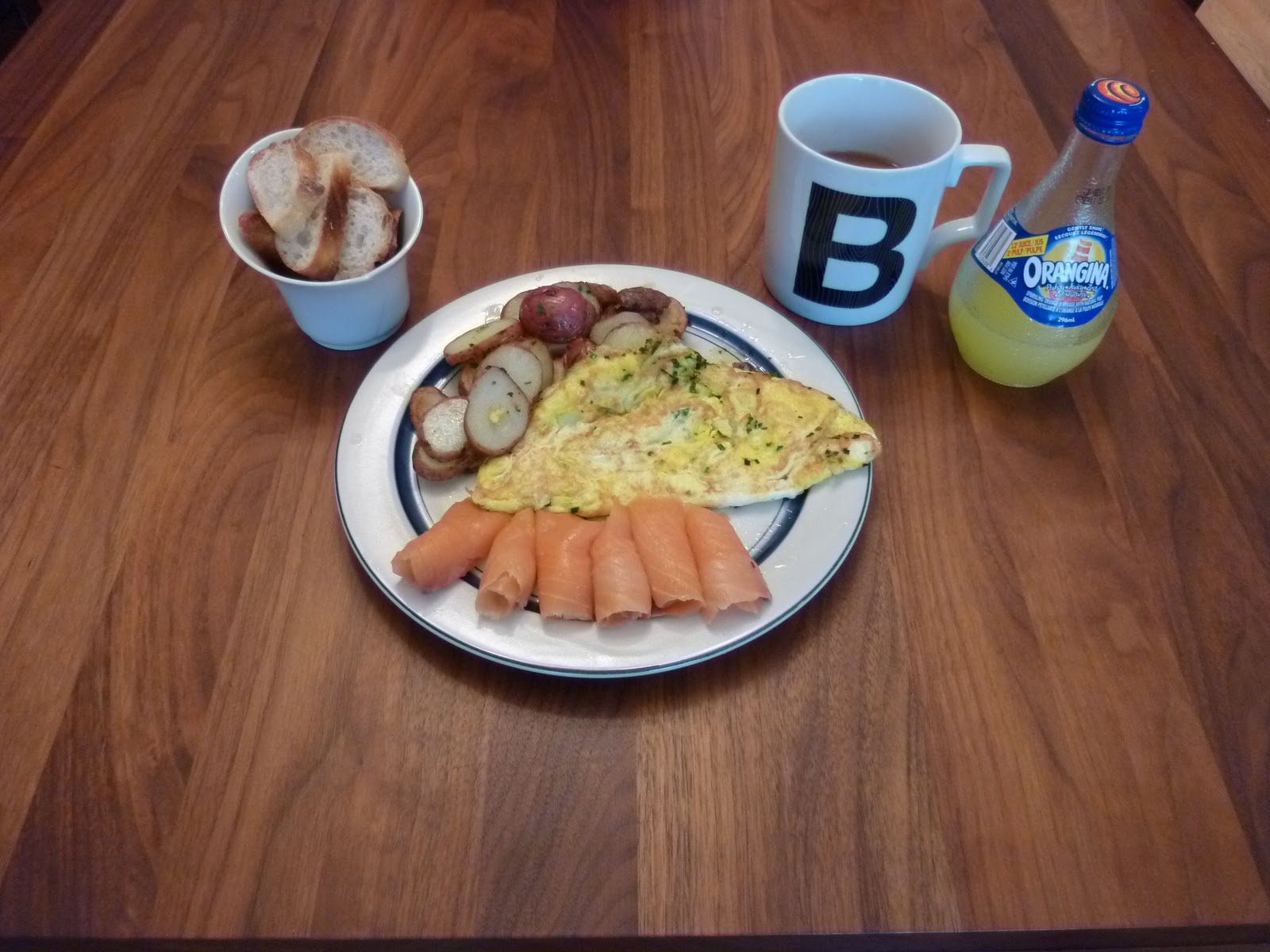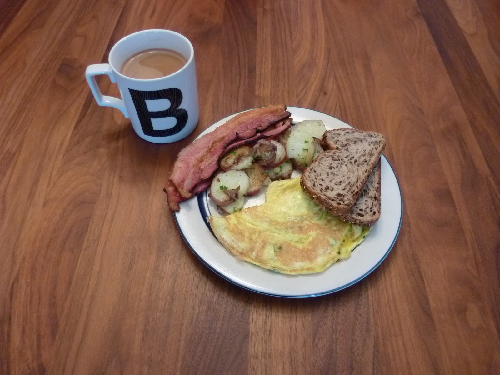 Here’s Saturday’s brunch of an omelet, roasted potato home fries with fresh herbs, multigrain toast and bacon!