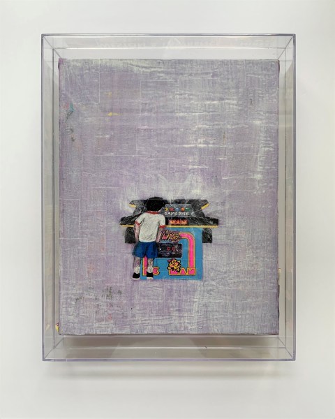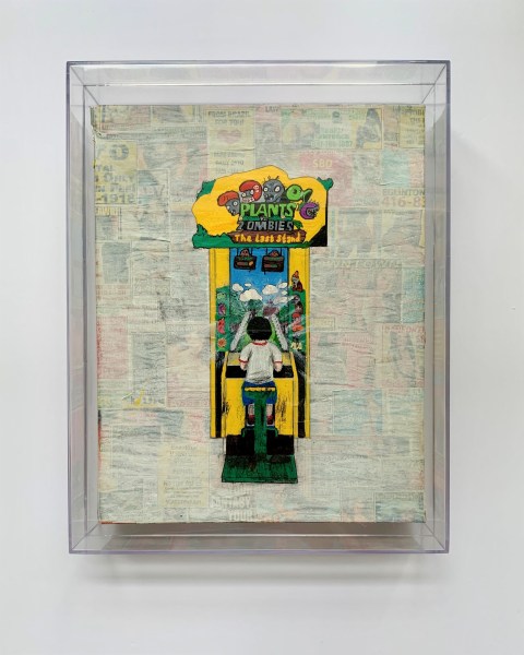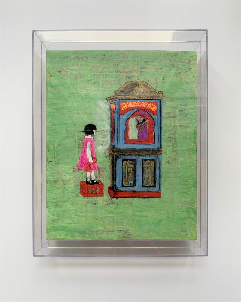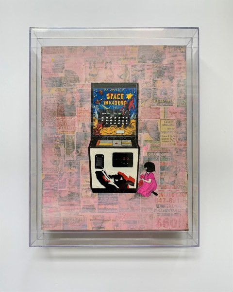 “Congratulations, You Played Yourself” (2019). Oil and acrylic on canvas and newsprint clippings (vintage escort and massage advertisements). Series of six drawings (10″x8″).