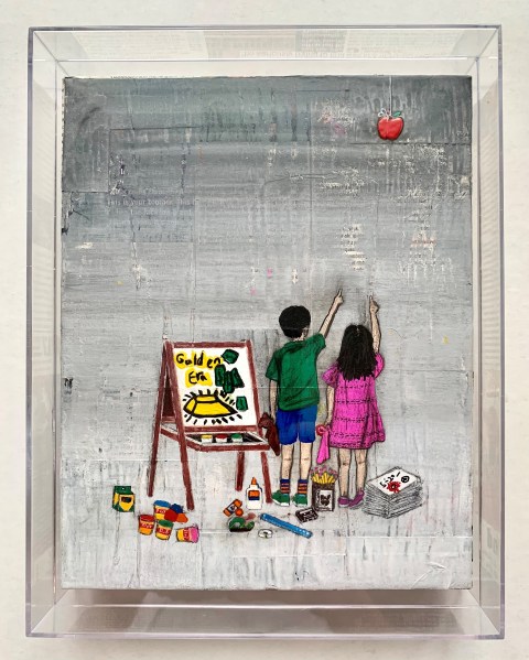 “Golden Era” (2020). Oil and acrylic on wood panel layered with vintage 90’s The Source and XXL magazine clippings. Series of three drawings (10″x8″).