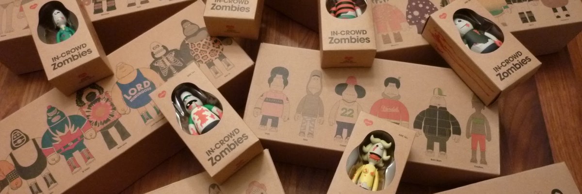 For the past year or so, I’ve been trying to track down some of Amos Toys‘ “In-Crowd” series of vinyl figures created by James Jarvis. The “In-Crowd” was a series of 10 sets of 8-10cm figures. Each set had 6-7 figures of a common theme such as Zombies, Wrestling, Heavy Metal, etc. With anything I collect, the challenge isn’t simply locating the item, its finding it at a decent price. That’s all part of the hunt and where the fun is. A few weeks ago, I was able to locate the coveted Zombie set and it arrived today! Here’s a shot…